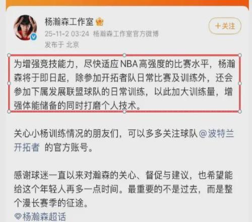 原来,开拓者官方和小杨工作室都对此进行了发声。开拓者官方告诉球迷们杨瀚森被下放是例行锻炼,且球队会在11月4日对阵湖人的比赛中将杨瀚森召回球队,小杨会继续参加NBA比赛。斯普利特教练组也没有放弃对杨瀚森的培养,相反这一次下放释放了两个积极信号。