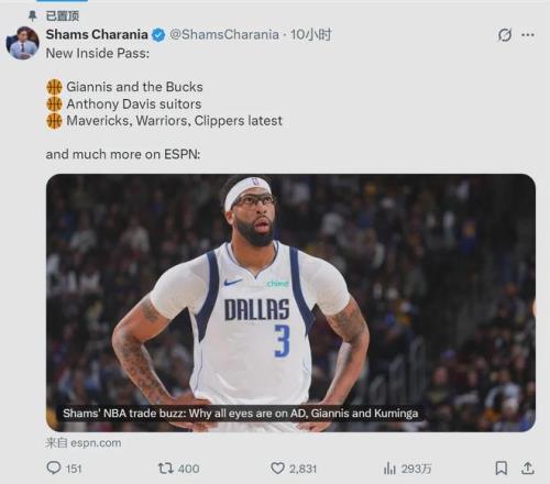 北京时间12月10日,NBA名记Shams在节目中爆料,安东尼-戴维斯的经纪人里奇-保罗已经跟独行侠管理层会面,并向管理层明确表态:“要么承诺在明年休赛期续约安东尼-戴维斯,要么就在本赛季将他交易,不要再浪费时间了。”